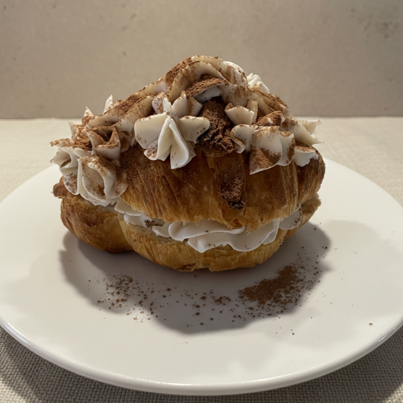 Vegan dough, tiramisu filling: vegan mascarpone cheese, coffee essence, and vegan whipping cream.